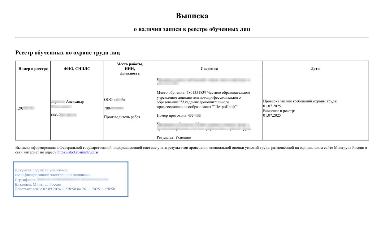 После завершения курса специалисты смогут грамотно организовывать работу по предотвращению травматизма, контролю за техническим состоянием оборудования, соблюдению нормативных документов.